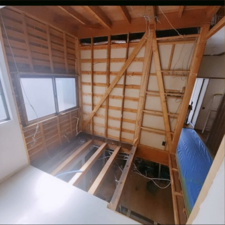 2階洋室の床を解体し、吹抜け空間へ。